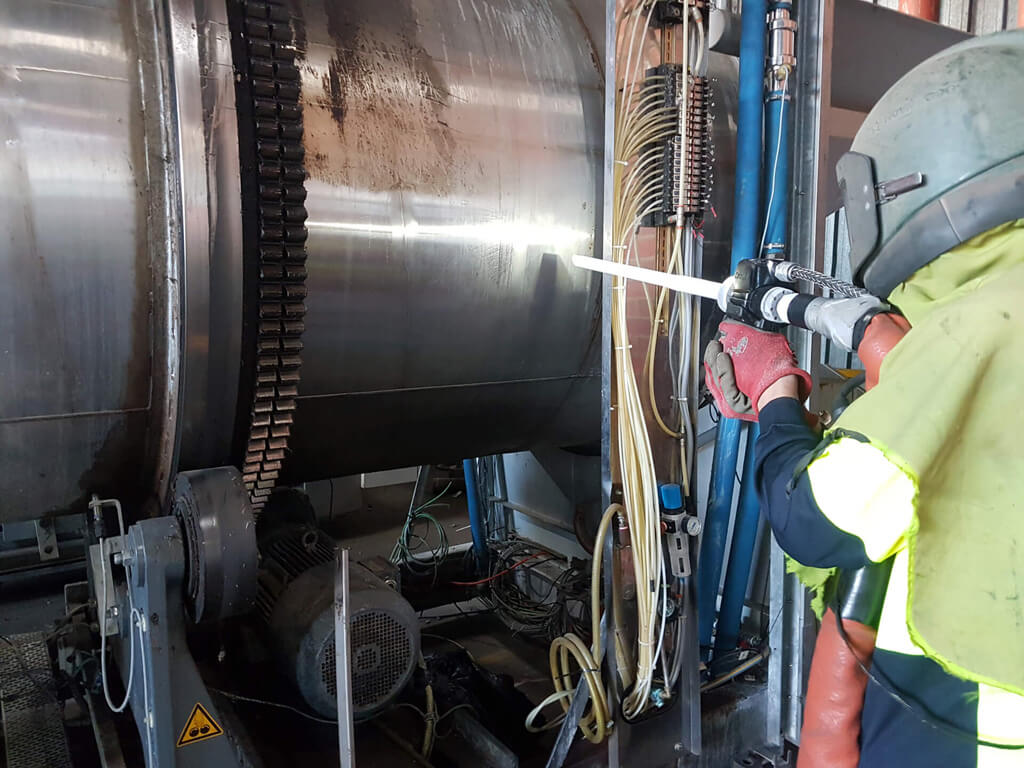 Polyspray’s dry ice blasting team brought three machines to site each putting out 175psi. Average consumption of dry ice was around two ton per day. The manufacturers of the dry ice had to start at 2am each morning to ensure Polyspray had enough ice for the following day. Once SPL saw the benefits of the dry ice blasting Polyspray was instructed to blast everything inside and out.